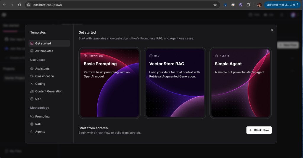 # 기본 설치 pip install langflow # 특정 버전 설치 pip install langflow==1.4.22 # 의존성 포함 완전 재설치 pip install langflow --force-reinstall # 최신 버전으로 업그레이드 pip install langflow --upgrade