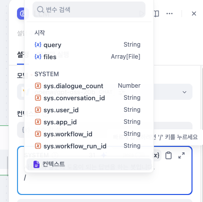 변수는 / 슬래시를 입력하여 드롭다운에서 선택하거나, 입력 필드에서 직접 선택하여 쉽게 참조할 수 있습니다.