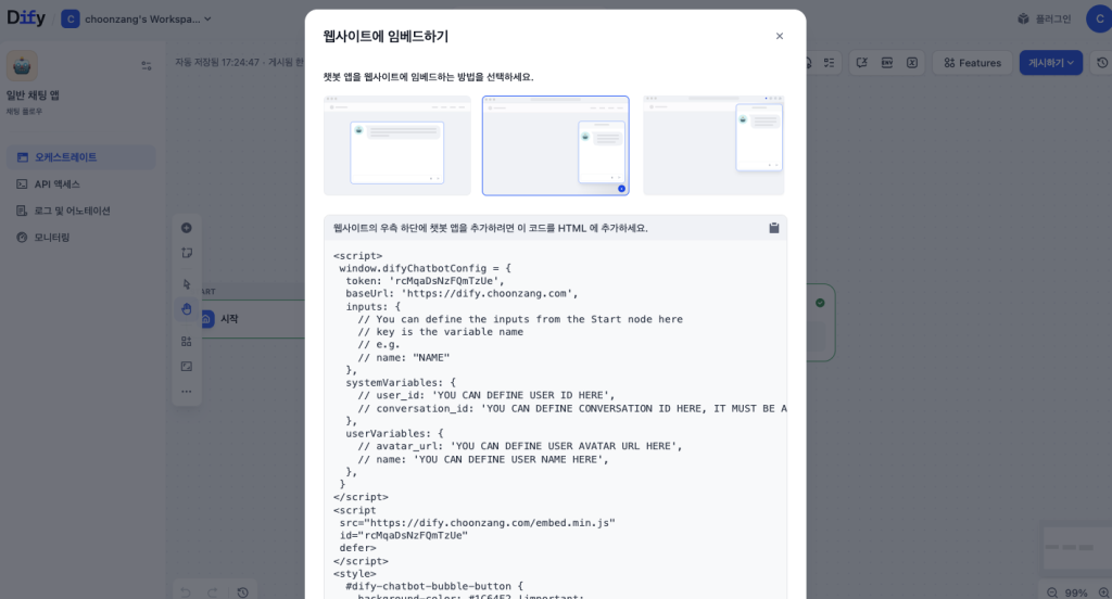 사이트 내 챗봇 생성을 할수 있습니다. 웹사이트 임베드 하기 위한 코드를 생성해서 HTML에 붙여넣기만 하면 됩니다.