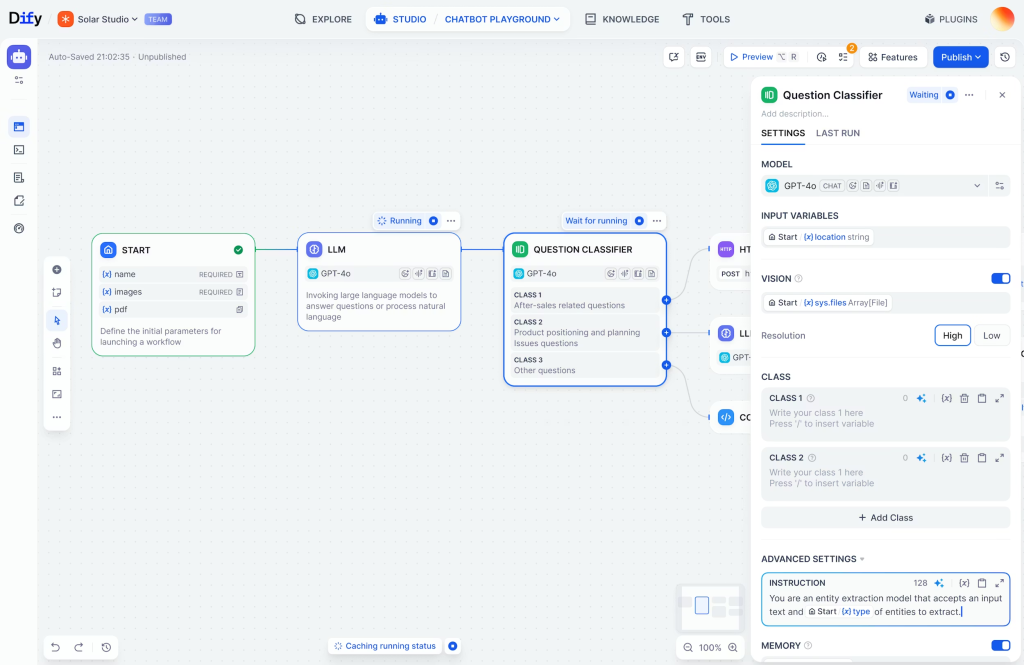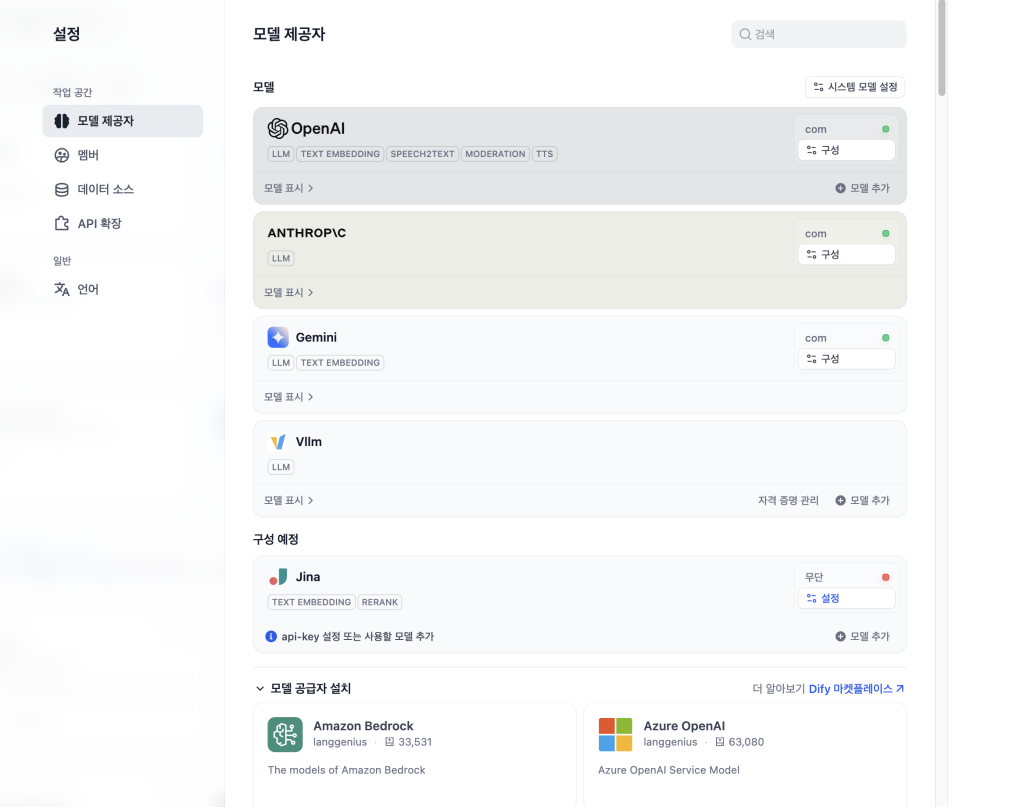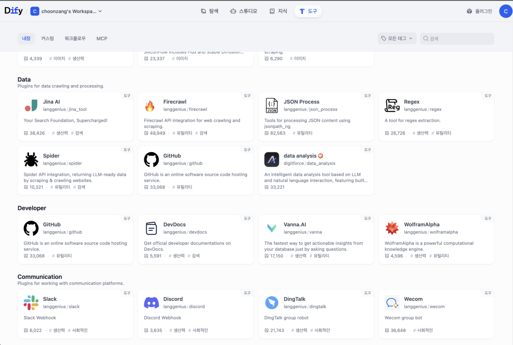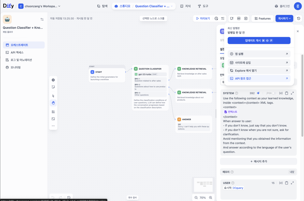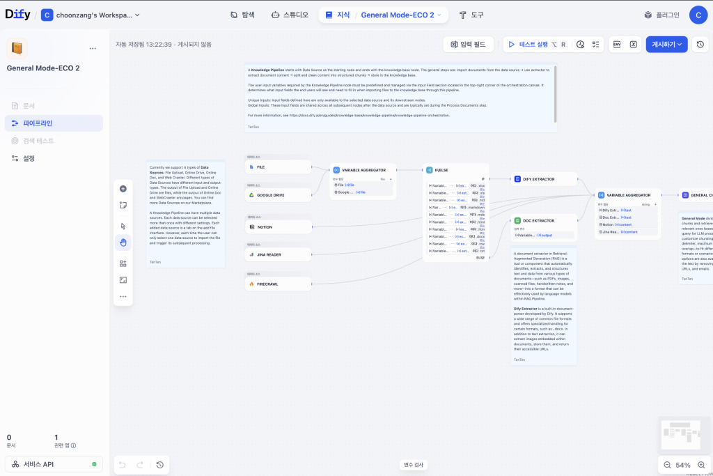 Dify의 가장 큰 강점은 드래그 앤 드롭 방식의 비주얼 캔버스입니다. 복잡한 AI 워크플로우를 시각적으로 설계하고 테스트할 수 있어, 개발 시간을 대폭 단축할 수 있습니다. 각 노드를 연결하여 데이터 흐름을 구성하고, 실시간으로 결과를 확인하며 디버깅할 수 있습니다.