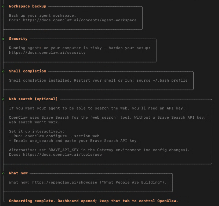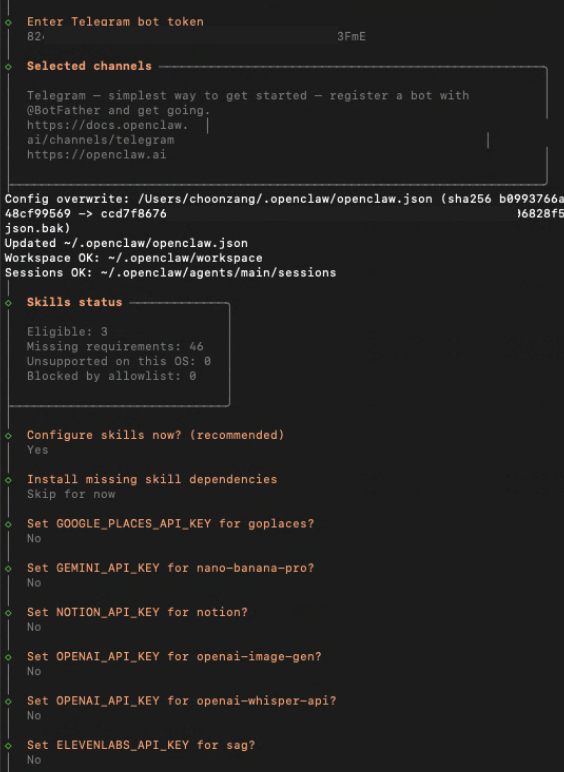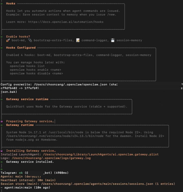 9. “Enable hooks?” 이것은 특정한 이벤트가 발생될때 자동으로 실행되는 동작을 정의할것인지에 대한 질문입니다. 예를 들자면, 새로운 세션을 생성할 때, 이전 데이터를 메모리에 저장하여 대화의 연속성을 유지할것인지, 모든 명령을 로그에 기록할 것인지, 에이전트 시작할 떄 특정 마크다운을 읽어드리고 시작할지 등을 의미합니다. 4가지로 session-memory, command-logger, boot-md(BOOT.md가 gateway실행 시 읽어들이기), bootstrap-extra-files (신규추가, glob/path 패턴에서 추가 워크스페이스 부트스트랩 파일을 삽입)