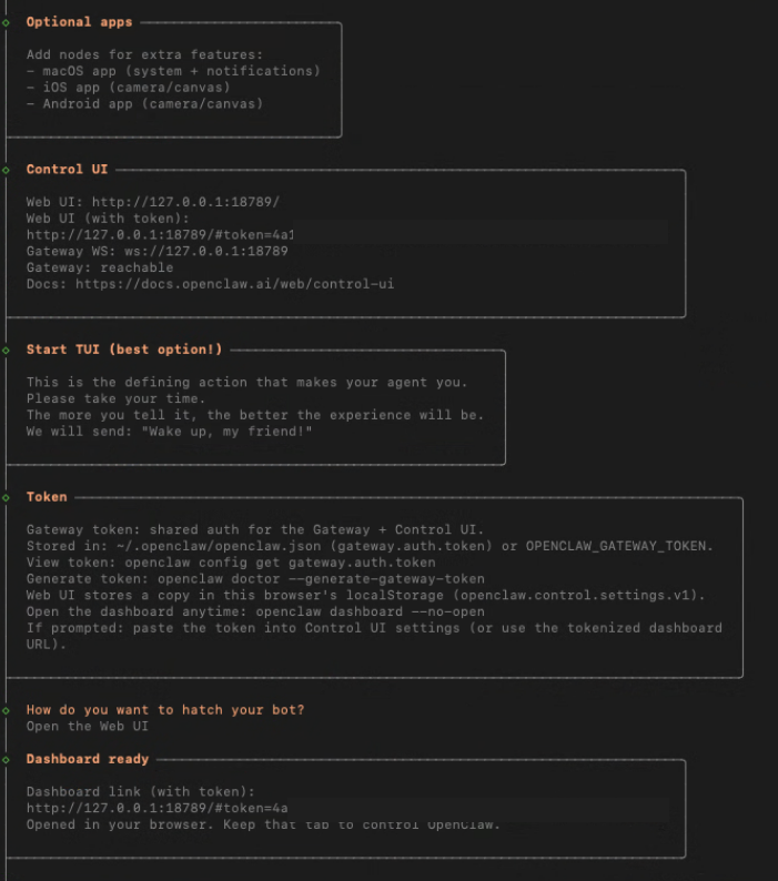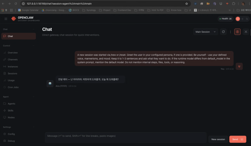 10. 설치가 완료되면, 마지막에 “How do you want to hatch your bot?”이 나옵니다. TUI (터미널)을 이용하여 사용하시는 분도 많지만, Web UI가 제일 편한것 같습니다. “Open the Web UI” 를 선택하면, 웹브라우저가 열리면서 챗봇과 대화할수 있게 됩니다.