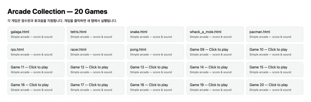 아케이드 게임을 20여가지 만들어달라고 아주 간단한 요청을 했습니다. 모델은 GPT 5 mini를 사용했는데, html, css, javascript 기반으로 금방 20개의 아케이드 게임을 만들어냈습니다. 그러나, 품질은 썩 좋지 않습니다. 하나의 게임을 진행속도만 다르게 20여개로 다르게 한 터치 게임을 만들어 냈습니다.
