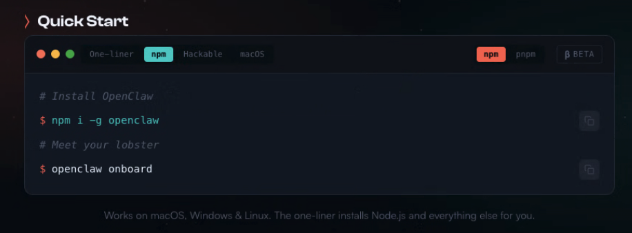 우선, openclaw.ai로 접속을 하게 되면, 설치 방법들이 너무 쉽게 나와있습니다.