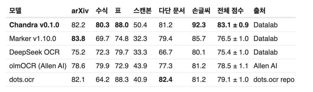 최근 LLM(대규모 언어 모델) 기반 OCR 솔루션이 많이 등장했지만, Chandra는 몇 가지 중요한 차별점을 가지고 있습니다: